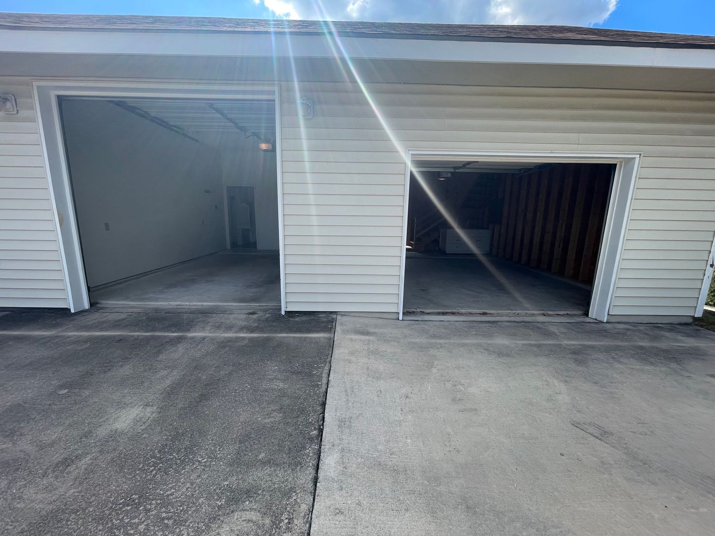 The property features two oversized garage spaces, ideal for a hobby or vehicle, plus a circle driveway with ample parking. The yard is semi shaded by large, mature oak trees, with a seasonal creek along the back of the property.