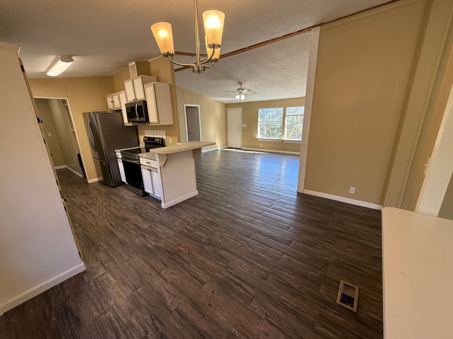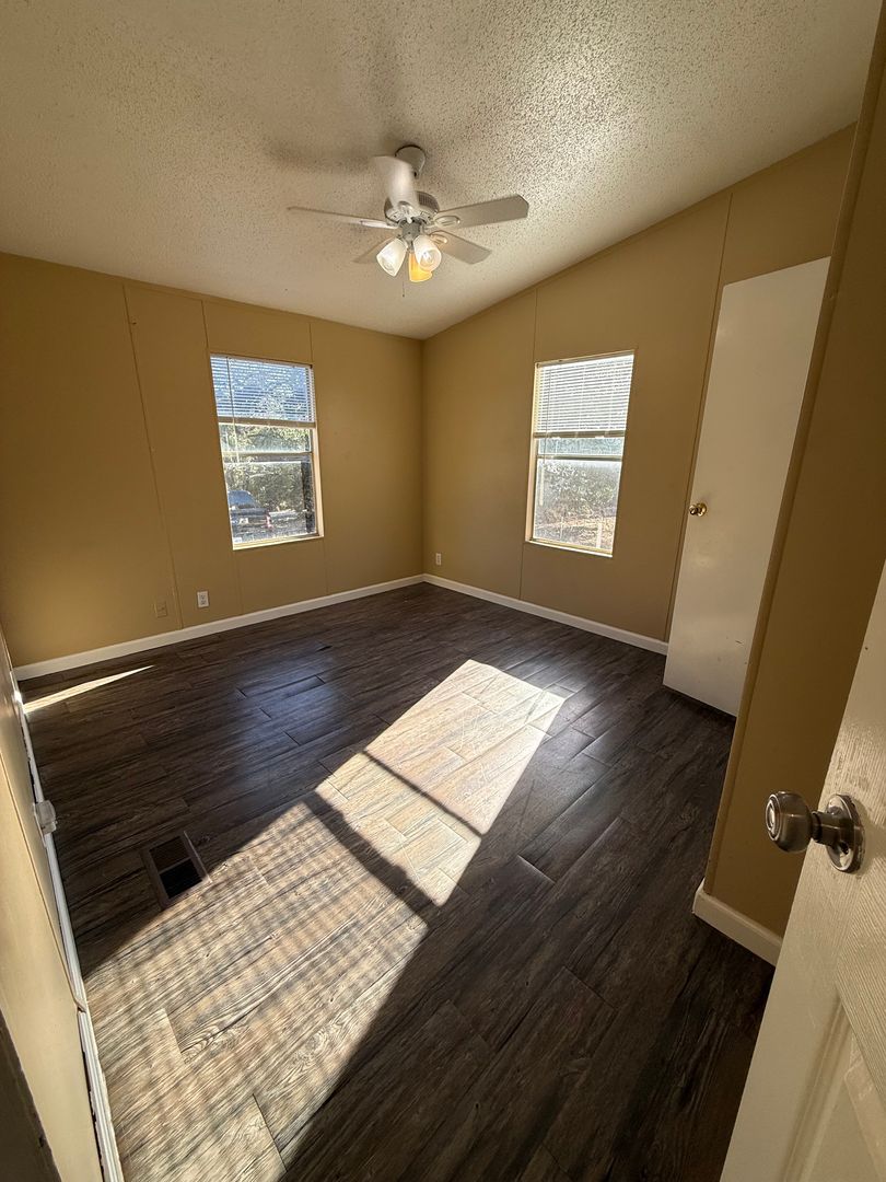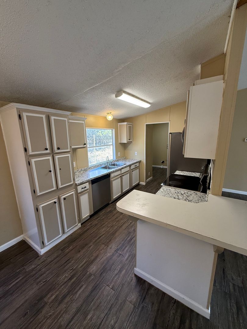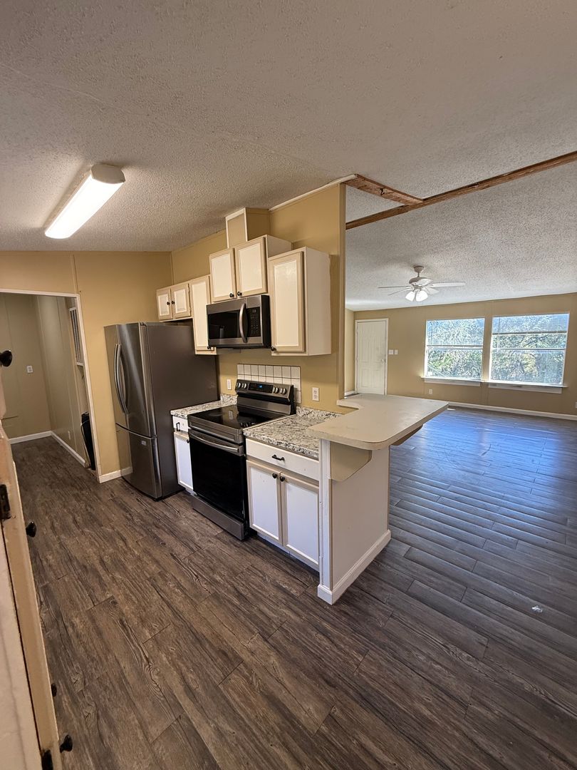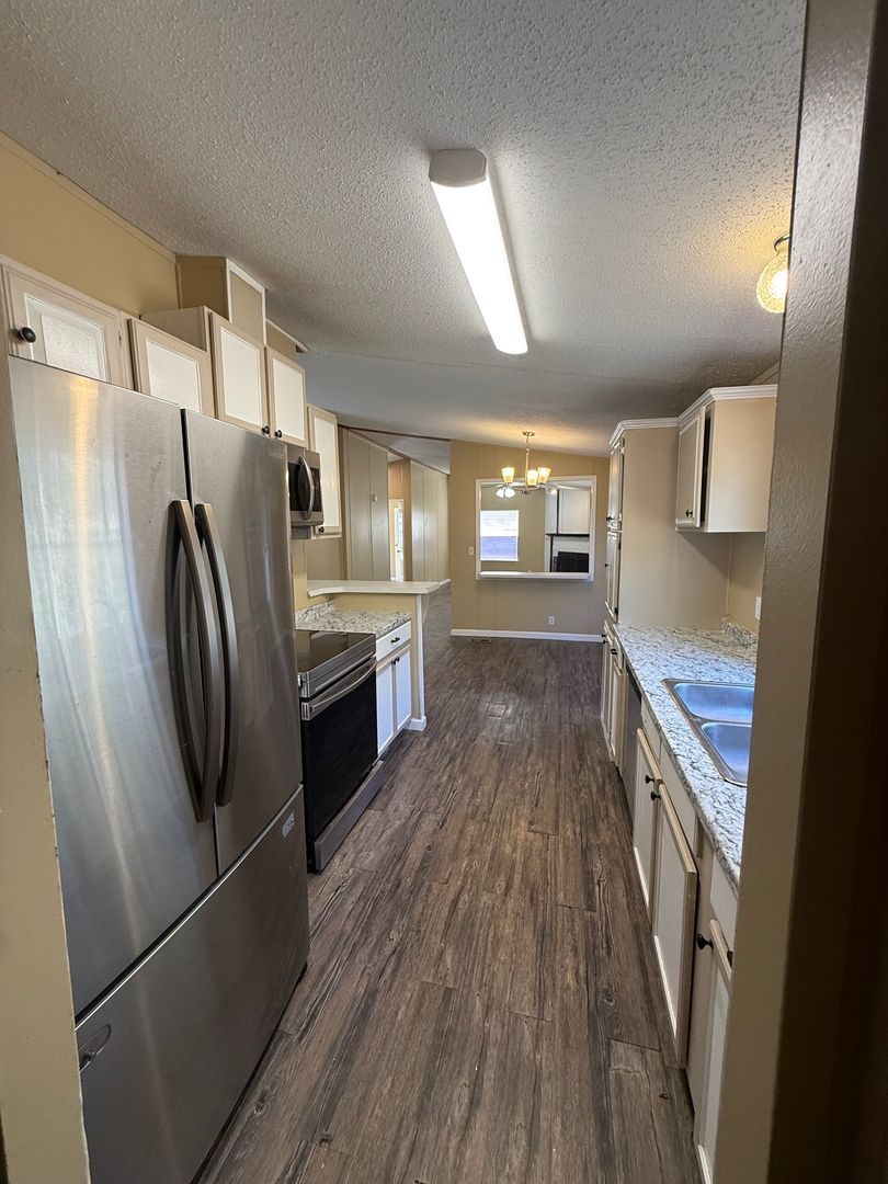 Private home tucked away in the woods off a quiet county road. This spacious 3-bedroom, 2-bath doublewide offers nearly 1,600 sq. ft. of living space, including two living rooms—one featuring a cozy fireplace. The home has been recently updated inside with fresh paint, new flooring throughout, updated fixtures, newer appliances, and more.